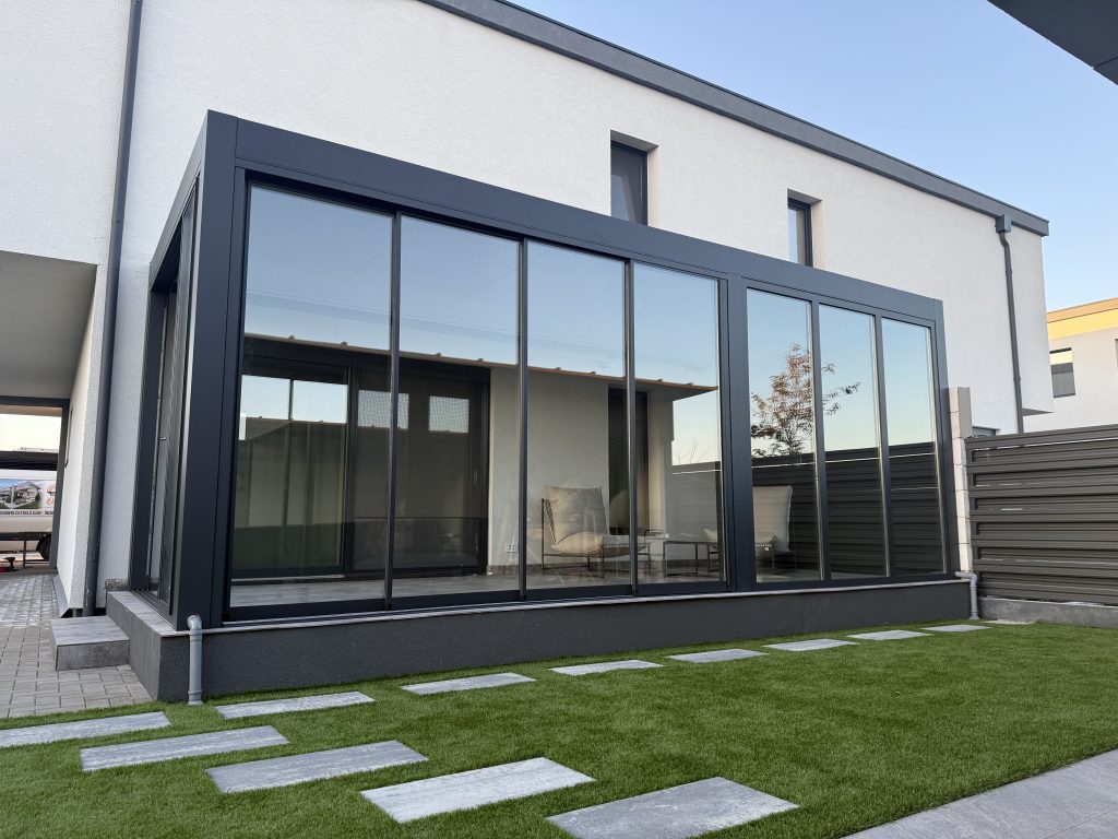 Această combinație creează o terasă închisă modernă, ideală pentru relaxare în orice sezon: